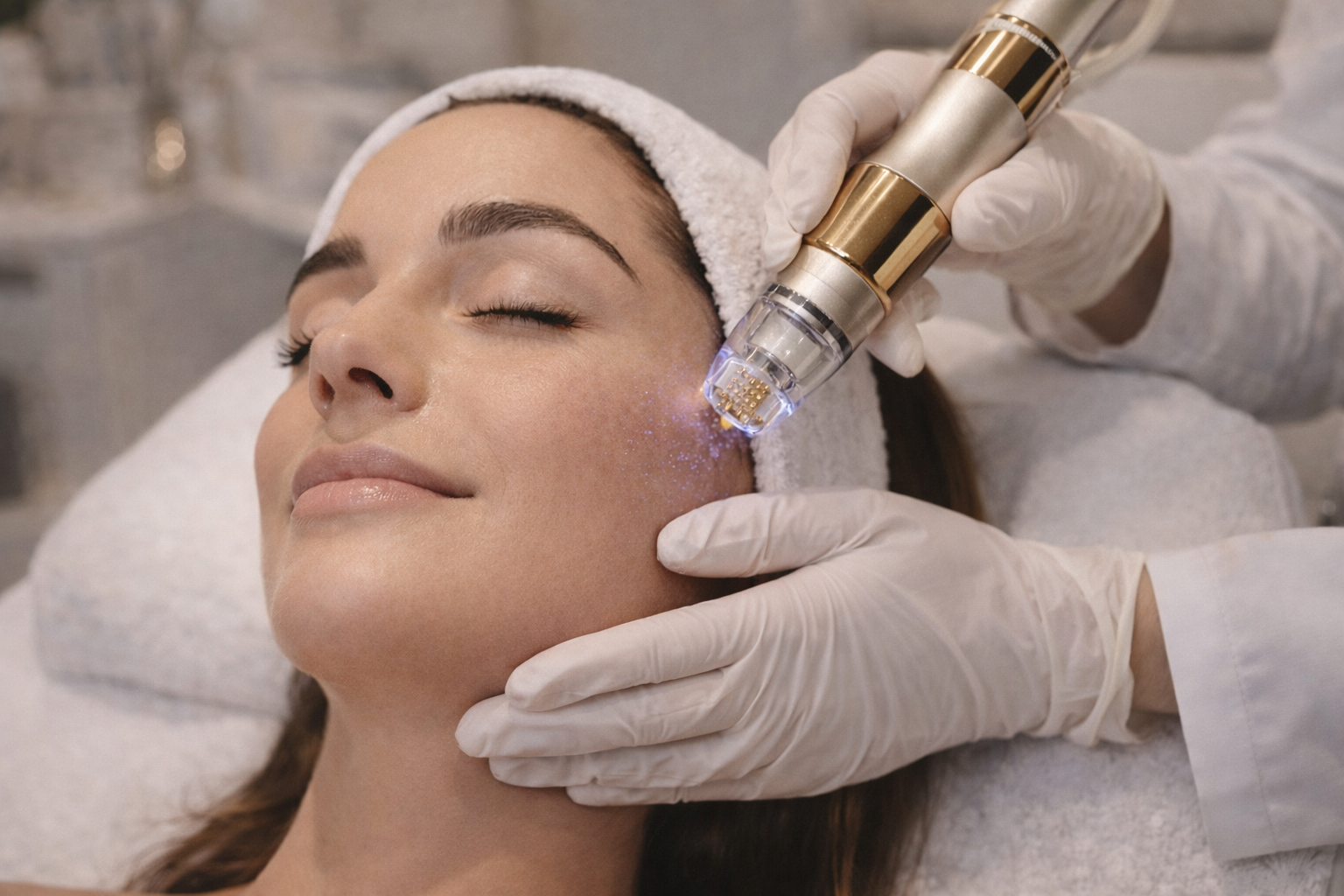 Reinigung & Desinfektion, Betäubungscreme, Behandlung mit RF-Microneedling, beruhigende Abschlusspflege und Pflegeempfehlung.